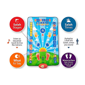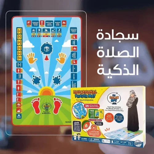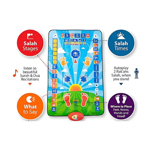 سجادة تعليم الصلاة الالكترونية للأطفال تحتوى على 36 زرار يعمل باللمس وتحتوي على 7 لغات